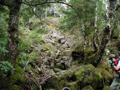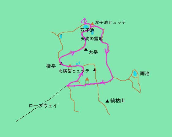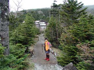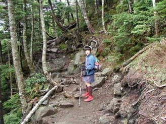 この日はずっと雨という予報なので、林道を通って雨池の方へ南下し途中から雨池峠へ登る道を選びました。このルートは比較的楽でした。林道歩きが約1時間、その後岩のゴロゴロした急登に約40分かかって雨池峠に到着しました。縞枯山荘の前からは木道がロープウェイ駅まで繋がっていました。