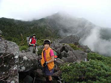 横岳の下りは結構急なところがあり、一カ所鎖も付いていました。はしごも数カ所かかっています。大きな岩がゴロゴロしていて、歩きにくく特に子どもの歩幅では大変でした。大岳の肩までコースタイム40分のところ1時間10分かかりました。そこから先も大きな岩のゴロゴロしているところが続きはかどりませんでした。天気も今にも雨になりそうな感じで、気分は沈みがちでした。