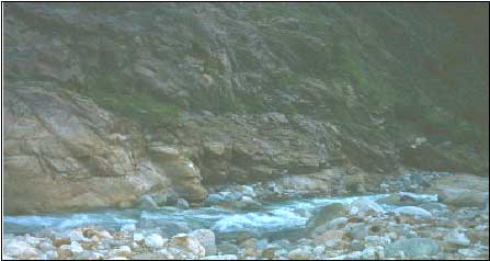 水俣川と中東沢合流手前の岸壁「左岸」を,避けて最初の渡渉を行い