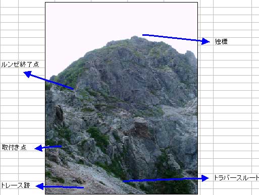 " 今回は、正面右側より,岩の間を3m程周りこみ左側より、ルンゼ"