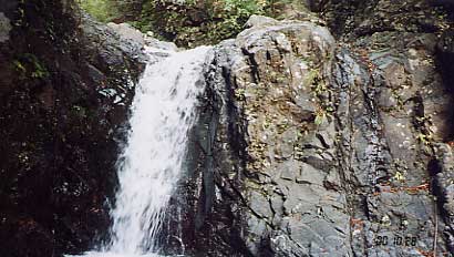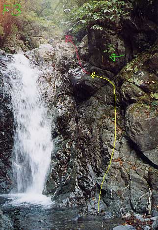 問題のF3(7m)である。鎖はこの写真より左側に付いている。うまい人は右側も登れる。黄色のラインで登って、緑の矢印の位置にボルトとスリングがあるが、その先赤矢印のトラバースが悪い。(事故多発地点)ホールドが少なく、足下は外傾していて濡れている。私はボルトのところまで登って止めて、左の鎖を登った。ガイドには、鎖を登っても上部のトラバースが足場が悪いので、右を登ってしまおう、と書いてあるがそんなことは全くない。こちらの方が安全だ。F4は印象に残っていない。F5は鎖がついており、これに全面的に頼って登ってしまった。F5の先へ書策新道が沢を横切っており、ここで休憩した。
