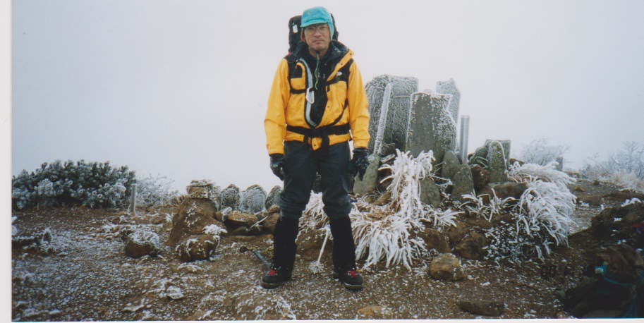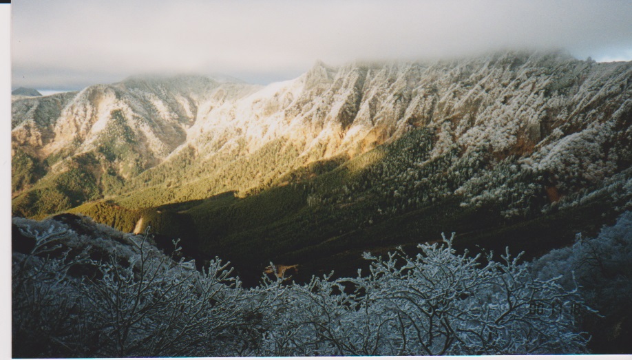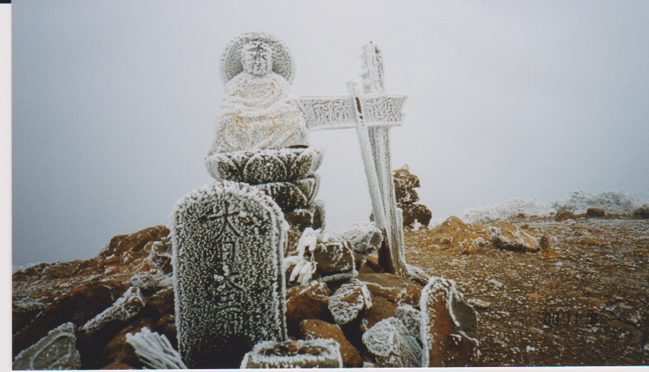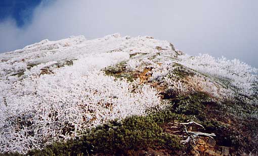 下から見た感じでは雪も積もっているのではないかと思ったが登っていくと白いのは木に霧氷が着いているだけで地面には全く雪はなかった。