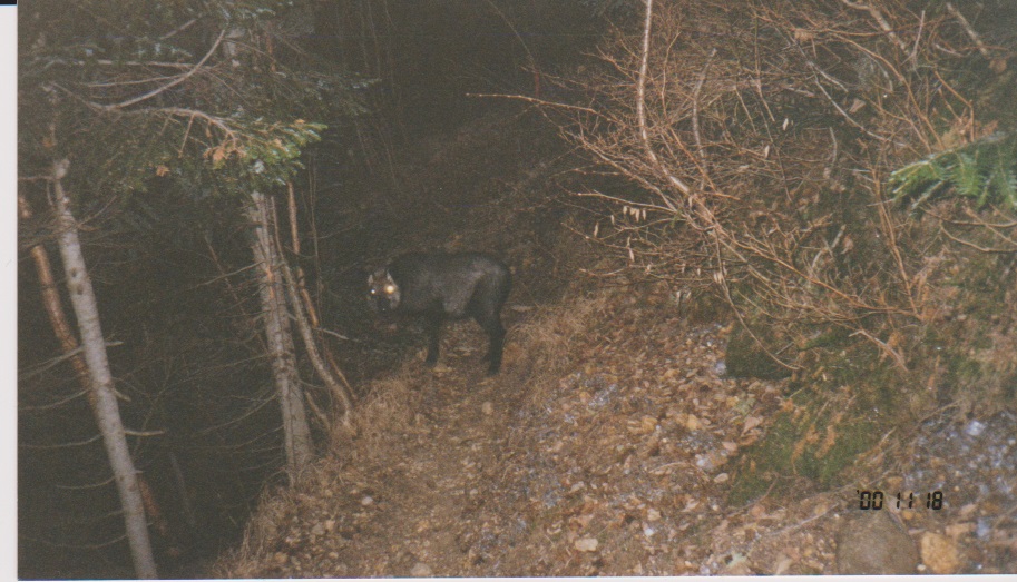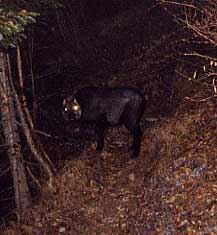 途中、暗い登山道で登山者が立っていた。近づくとその先に鹿がいて木の葉か実か何かを食べている。
