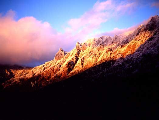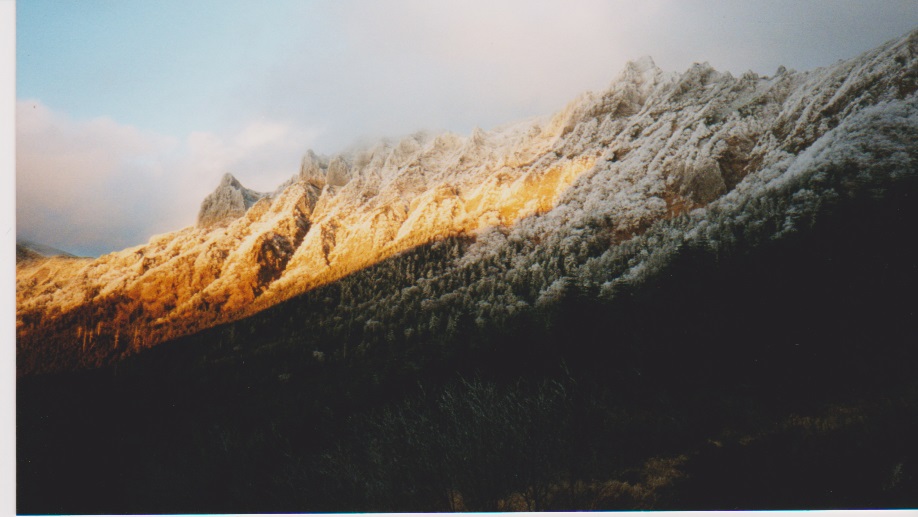 中岳のコルまで降りてきたら雲が晴れてきて眺望が開けた。南側に権現岳、北側に夕日に染まる横岳が望めた。