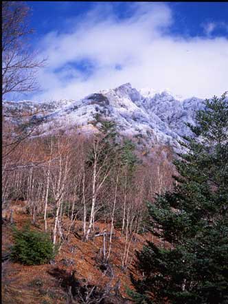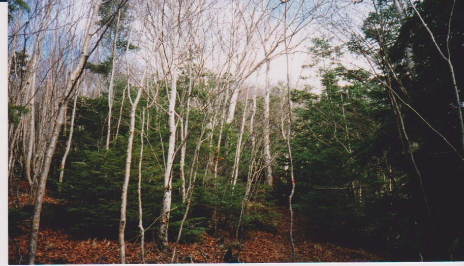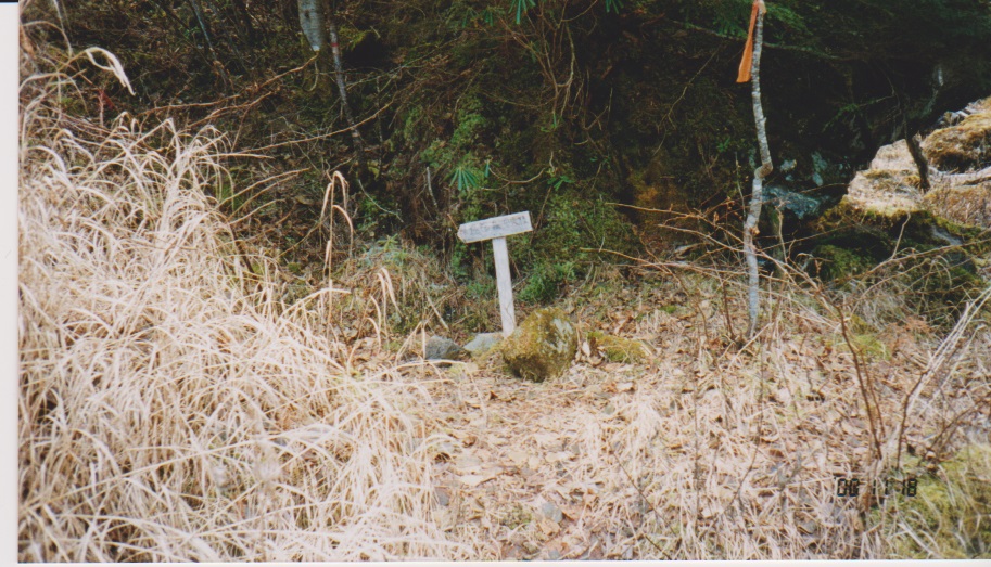 10:20歩行開始。しばらく広河原沢沿いの林道を歩くが、堰堤を越してからは狭い踏み跡だけになった。そのうち踏み跡も消え、沢づたいに歩けるところを探しながら登っていった。中央稜末端の二俣に11:10到着。この左俣から取り付くルートもあるが、右俣からのルートの方が一般的のようなので、右俣へ進んだ。そのうち左側から小さな沢が合流し、古い小屋のつぶれた跡をすぎると、赤テープと粗末な看板があって取り付き地点と分かった。12時ころだった。この取り付き地点は既に標高2050メートルもある。