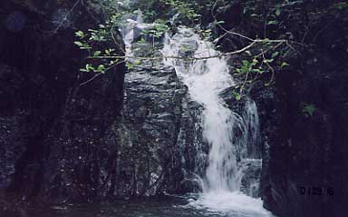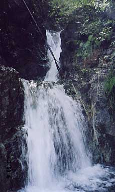 全ての滝を高巻きせずに登ったが、上の写真の(おそらくF5)が一番手こずった。初めは高巻きしようと思って途中まで登ったが、上部のトラバースがすべりそうで、滝の右側の壁を登ったほうが安全かと思い、一旦下りて登りなおした。上部にハーケンが3本打ってあり、そのうち2本にスリングが付いていた。手がかりはあるのだが最上部で足がかりが心許ない。また一旦おりてハーネスを付け、スリングやカラビナを用意した。登り返して最上部のハーケンに短いスリングとカラビナでビレーをとった。ほんの一歩のことなので、これで思い切りがつき、登り切ることができた。ここからもう一つ滝を登って林道と交差する地点に着いた。ここまでほぼコースタイム通りで10:20だった。
