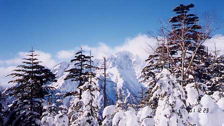 そのうち、少し眺めの開けた場所に出た。雪を被った明神岳と前穂高岳が見えた。