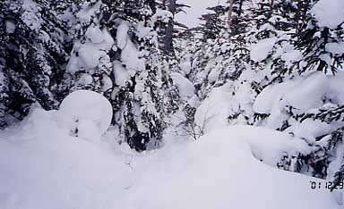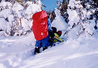 この先ますます雪が深くなった。膝から腿くらいのラッセルだが、時折腰までもぐった。