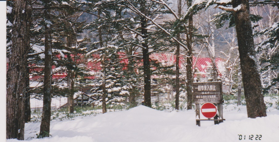 しばらく歩くと半分氷結した大正池が見えてくる。大正池ホテルはまだ営業していないようだった。