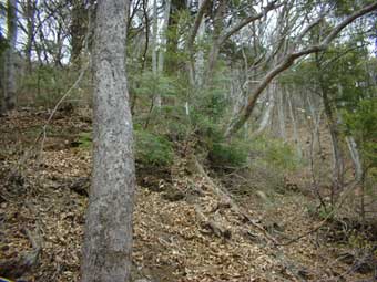 1766メートル地点は12:00に通過。1400メートルまでは藪に悩まされ、その下は、滑りやすい枯れ葉の積もった急な下り坂に神経を使った。
