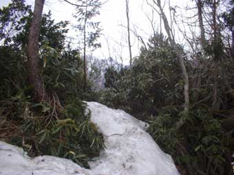 稜線に出られたのは13:20。1時間半かかった。雪が少し出てきたが、藪が出ているところが多く、1400メートルから1600メートルくらいまでは藪こぎに悩まされた。