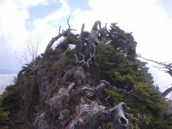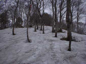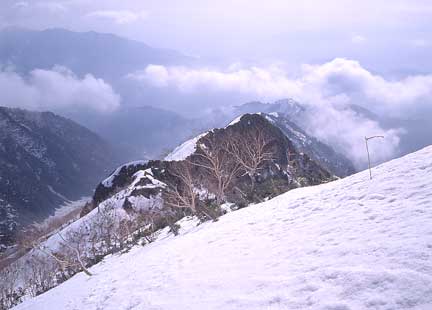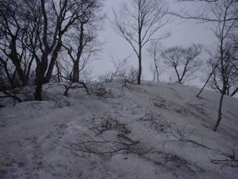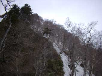 上の写真は稜線上岩と枯れ木の露出した部分。往きは下降で帰りは登りになる。両側が切れており、不安定な雪が付いた状態ではロープがあった方が心強いかもしれないと思った。