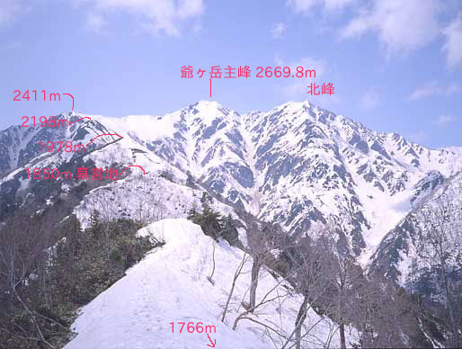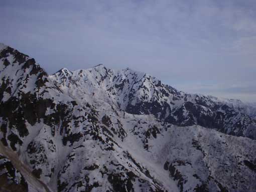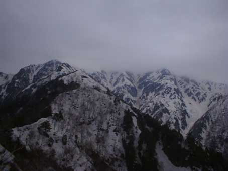 下降路は東尾根をもどるか、赤岩尾根を降りるか迷いがあり、気が変わるといけないので荷物は全部持ってきていた。赤岩尾根は以前このシーズンに上り下りしたことがあり、爺ヶ岳東尾根より簡単に降りられるはずであった。今、登ってきた所を降りるのは、かなり急な雪の斜面や露岩や藪こぎなど、あまり通りたくないところもあるが、往復することで、ルートの理解がより深い物になると思い戻ることにした。