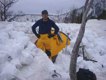 この日は爺ヶ岳頂上は望めなかったが、頂上付近までは見渡せた。ここにテントを張っても良かったが、もう少し頑張ることにした。本には1978メートル地点が幕営に良いと書いてあったが、その手前1850メートルにも少し稜線が平坦になったところがあったので、ここに泊まることにした。はじめ、雪洞を掘ろうと思って試しに少し掘ってみたが、場所が悪く枝が出てきてしまったので止めにして、別の場所にテント用の縦穴を掘ることにした。40分ほどかかってほぼテントの高さと同じくらいくぼんだテントサイトができた。これなら夜間に風が吹いても飛ばされることはないだろうと思った。