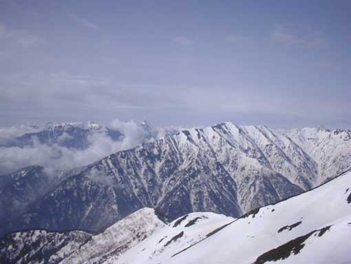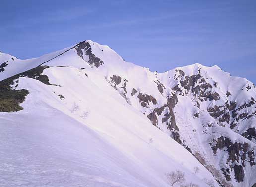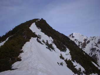 2198メートルのピークは小冷沢側を巻くと書いてあるものもあり、実際トラバースしている人もいたが、稜線にもどるタイミングが分からなくなるといやなので稜線通りに登った。数人先を登っていた。ここはかなり急な雪の斜面もあるし、稜線上は雪が溶けハイマツやごろごろした岩が露出しており、歩きにくい所もあった。7:00ころ2198ピーク。