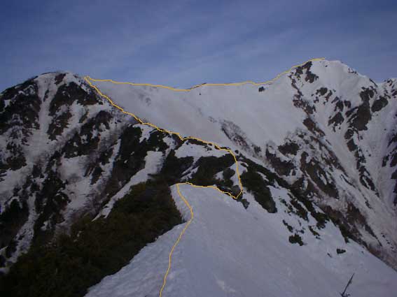 このルートは雪の安定した残雪期なら、初心者でない限りロープなどは不要と思う。