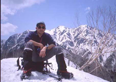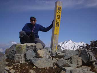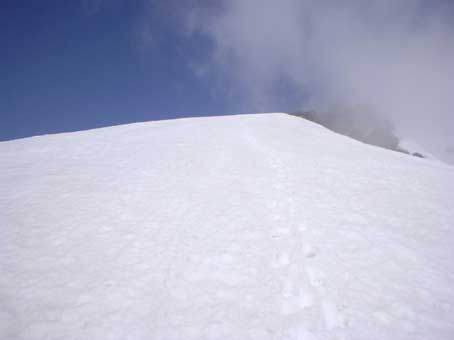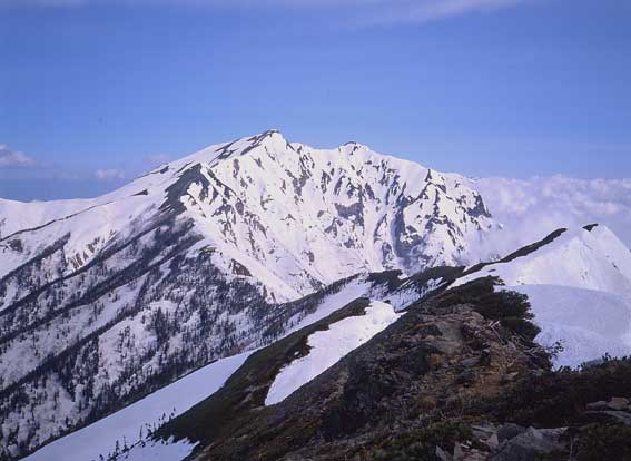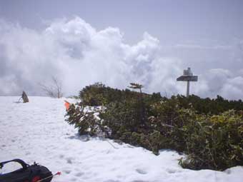頂上直下の最後の雪の斜面も、遠くから見るより傾斜が結構あり疲れた。最後の部分は雪が消えハイマツと岩の上をアイゼンを着けたまま登った。8:50登頂。出発してから3:30掛かった。途中で追い抜かれた単独行の人と会い、写真を撮りあった。天気が良く風もなかったので頂上で30分くらいのんびりした。