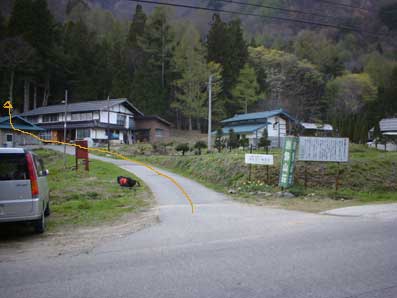 4月27日朝一番千葉発のあずさ号で松本まで行き、そこで次のあずさに乗り換えて大町に着いた。タクシーで鹿島へ向かった。東尾根の登山口は鹿島部落にある鹿島山荘(狩野宅)前である。ものの本には登山道は鹿島山荘の『裏』にあると書いてあるので分かりにくいが、下の写真の黄色の線のように、山荘の『前』を通って行く。