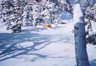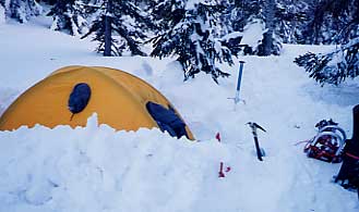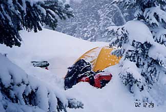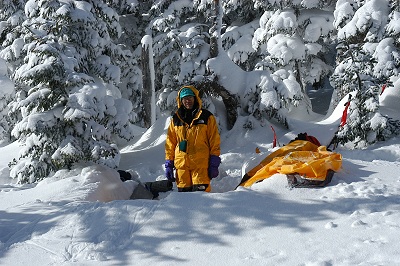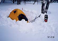 一昨日の私の幕営あとが、雪に埋もれながらも分かったので掘り返して、同じ場所にテントを張った。