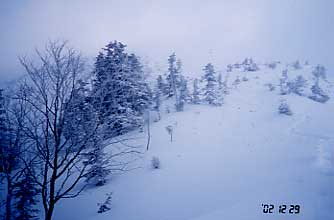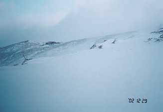 森林限界を越えると、風が強かったが、視界は概ね良好で小屋も見えた。風のため雪も締まっていた。