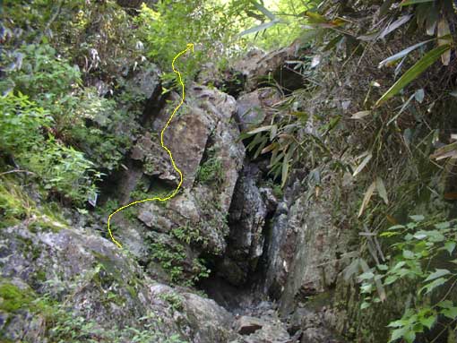 F9は写真の様に涸れ滝で高さは7〜8メートルだろうか。左右とも登られているようだが、右側の方はほとんど垂直の壁で難しそうだ。左側も決して易しくはない。