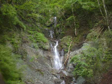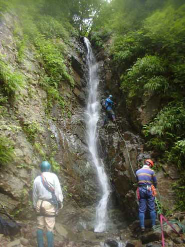 上の写真の奥に見えるのが10メートルのオーバーハングした滝で、これはあっさりと左側から高巻いた。その先少し行ったところに15メートル程の立派な滝が現れ、先行パーティーが取り付いていた。下から見ていると水流沿いに手がかりがありそうに見えたが、滝の落ち口付近の様子は良く分からなかった。ここも左側から高巻いて、滝の上で4人が登ってくるのを待った。かなりの時間を待つことに費やした。その後、残置ハーケンと新たに追加したハーケンとに支点をとって懸垂下降した。ここの懸垂下降はあまり気分のいいものではなかった。ユマールで確保し、滝の水を被りながら、登り返した。上部の岩が濡れたどろまみれで脆く怖かった。この15メートルの滝がこの沢の核心部のように思えた。自分で打ったハーケンは回収した。