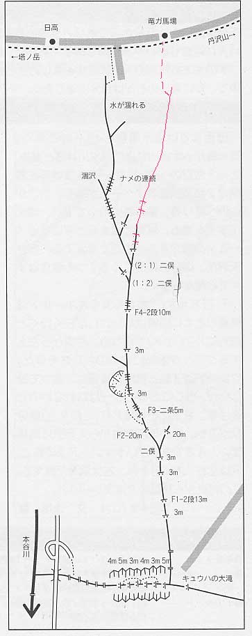 「丹沢の谷110ルート」の遡行図も不正確なことがSakaNakaさんの記録を読んで分かっていた。下の遡行図がそれで二股という文字が3つ出てくる。この本によると上流2つの二股の間が地形が変わっているというのだ。「以前の資料によるとこの二股と二股の間にはすばらしいゴルジュがあったらしい。ゴルジュの中に5〜6メートルの滝がいくつも連続し、10メートルほどのオーバーハングの滝、15メートルの滝などが威風堂々と立ちふさがっていたという。昔の風景に思いをはせながら二股を通過。」と書いてある。そんなにいくつもの滝が消えてしまうわけがない。私もこれを読んだ時に変だな、と思ったが、SakaNakaさんの記録を読んで納得した。自分たちが間違った所を通ったということを、少しも考えていないところが思い上がりである。私はどこかでこの遡行図とは違う方向へ行くべきだと思っていた。