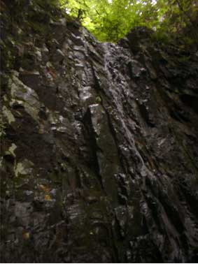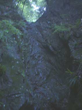 この沢のハイライトは12メートルの大滝である。水は涸れている。下から見上げると手がかりが豊富で登って行けそうにみえるが、落ち口付近が難しいらしい。無理をせず、例によって一旦左側のリッジから登り、落ち口の残置ボルトを利用し懸垂下降して、ユマールで確保しながら登りなおした。上部にハーケンが3本打ってあった。岩が逆層のためホールドが微妙で、ハーケンにスリングを通しA0で登った。