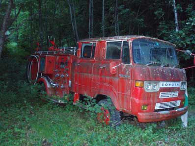 不気味な消防車 消防車が捨ててあるところのすぐ横に橋があり、 鎖で車両通行止めにしてあった。 |