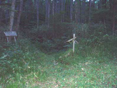 紛らわしい分岐点 少し林道をあるくと左の写真のような分岐部をしめす標識があった。 ここが沢登りコースと茶臼山登山道との分岐だと思った。 ネット上でいくつか調べた記録にはもっとしっかり字が読める標識の写真が 出ていたが、年月が経ったせいで読めなくなったかと思い右へ進んだ。 これが間違いだった。 (正解は左側へ進み、茶色の板に白い字ではっきりと”左 茶臼山、右 沢登り”と 書かれた看板のあるところで右に行く) 道はすぐ行き止まりになったが、ここがルートだと思っていたので 獣道のようなところを進んでいった。 いよいよ踏み後を見失ったかと思い沢の音がする方へ強引に藪こぎをした。 原生林のようだった。 しばらくするとはっきりした登山道に出た。 |