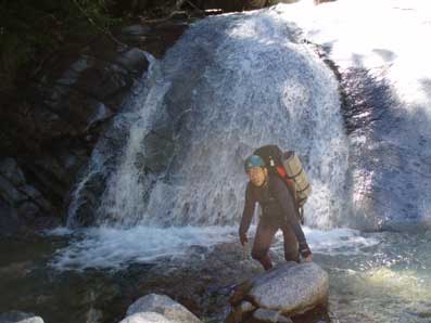 水が涸れる少し前に悩ましい二股があった。 水量はほぼ1:1だが右側はやや落差が大きく、左側の方が沢床が低い感じだった。 地図と磁石とGPSをさんざん見比べて左が本流と思い左へ行くことに決めた。 水がなくなる前にフリーズドドライの”ぶっかけとろろうどん”(アマノフーズ)というのを 食べた。上出来。 本流と思った方を登って行った。 |