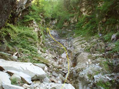 右側の枝沢から高巻き 14:00 やっと大滝右側のガレた沢を登ることに決心した。 ガレてはいるが水が流れていた。 途中左側へトラバースしたくなるところがあるが、どうもその先は危なっかしいらしい。 ここは徹底的に上まで登ってみることにした。 最上部のやや立った感じの部分は左寄りが階段状で登っていくことができ その上で沢は傾斜をゆるめ簡単に左側の尾根に登って行ける。 尾根を登っていくと大滝上の沢が見え適当にルートを選びながら降りていった。 懸垂下降は不要であった。 30分で高巻き終了。 これが一番安全なルートなのではないか。 |
