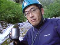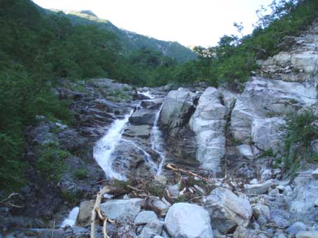 8月11日(土) 朝4:30に起きた。 朝食はしそわかめご飯と納豆汁。まあまあの味だった。 テントを撤収して6:30出発。 昨日からずっと眺めていたナメ滝の登りから始まりだ。 この滝を登り切ったところでハンマーをテント場に置き忘れてきた事に気づいた。 このハンマーはミゾー製で1万円くらいするもので、 以前、立場川本谷を登り阿弥陀岳南陵を降りたときに 南陵の途中に置き忘れたことがあった。 この時はかなり降りてから気づいたので取りに戻らず同じものを再度購入したが、 今回は取りに戻ることにした。 登るのは易しいが、降りるのは少し緊張する。 立木を利用して懸垂下降2回で降りた。 テント場に戻ってみるとちゃんとハンマーがあった。 この上り下りに約30分かかった。 気分も新たに再出発。 |