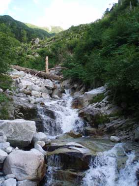 左側から枝沢が流れ込むのを見ながら本流を右へたどっていく。 |