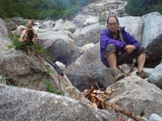 大岩ゴロゴロ 細尾沢出合までは滝はない。 大岩がゴロゴロしているゴーロ帯をひたすら登っていく。 出発前に要所要所の緯度経度を測定し地図に書き込んでおき、 時々GPSで位置を確認していたのだが、 明るくても深い谷では衛星を3つしかキャッチできず正確に測定できないようだった。 なんとか緯度経度は表示されるのだが高度がでたらめだった。 |