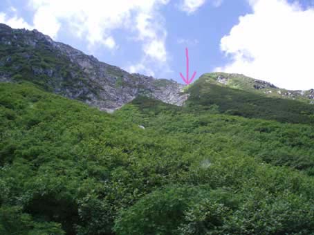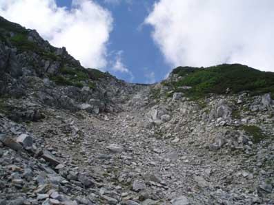 これが目標のガレた斜面。 遠くから見ると傾斜が急に見え、登れるのか不安であったが いざ登ってみると傾斜はさほど強くなく、不安を感じずに登っていくことが出来た。 最後は少し右寄りにルートを選ぶとハイマツの稜線に出た。 |