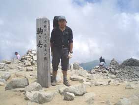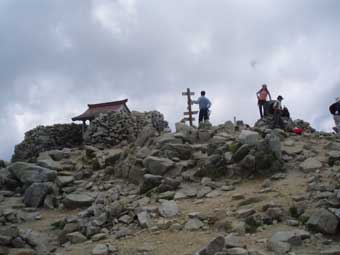 木曽駒ヶ岳山頂到着 11:10 出発してちょうど5時間だ。 この山は反対側にロープウェイがあるので軽装の人がたくさん登ってきている。 私は頂上に登るまでの2日間は一人の人間にも会わなかったが 頂上ではたくさんの人に会った。 |