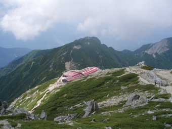 頂上木曽小屋が見えてきた。 写真は小屋を過ぎて山頂近くから見下ろしたもの。 |