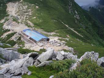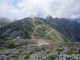 少し進むとまずこの小屋が見えた。 玉ノ窪山荘だ。 ハイマツ混じりの岩場をトラバース気味に進んでいくと登山道のロープが見えた。 |