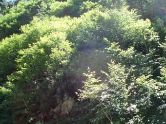 見晴らしが良くなってくると目標となるガレ場の斜面は 1本となりの沢筋につながっているように見えてきた。 灌木の斜面を強引にトラバースした。 灌木の幹は横向きに生えているので、体を低くして枝の下を見ると意外に 地面が見えた。 枝を折らないように気をつけながら枝を跨ぎ跨ぎで隣の沢筋へ進んだ。 |