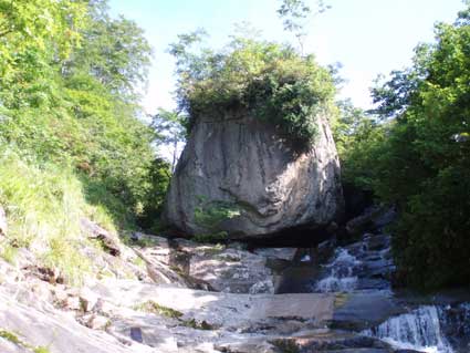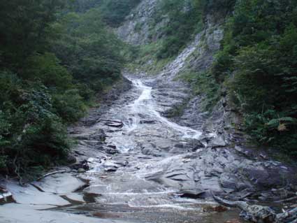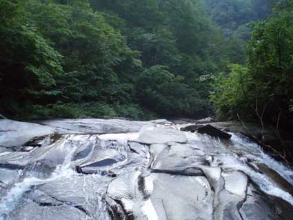 すぐ上が20メートルのナメ滝である。 一見どこからでも登れそうだが、傾斜はそれほど緩くない。 私は右寄りを登ったが左側の方が登りやすいと書いてあるものもあった。 ナメ滝の上に三平さんが顔をのぞかせている。 |