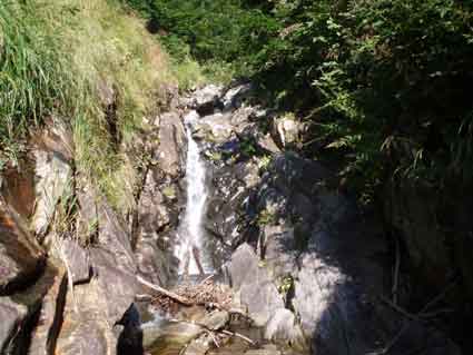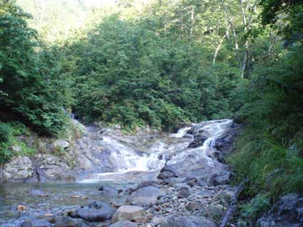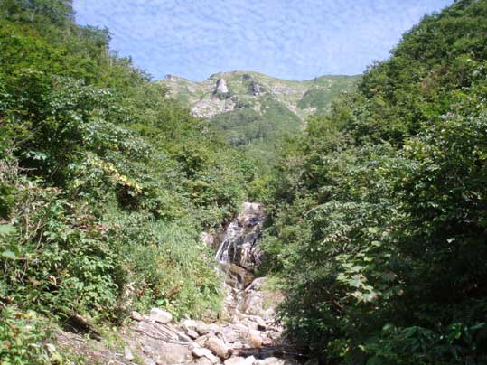 タラタラのセンの落ち口のすぐ上にこんな小滝が現れるが、 これも登れず左から巻いた。 |