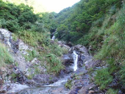 白毛門沢に入ってからも沢は明るく穏やかだ。 数メートルの滝がいくつか現れた。 |