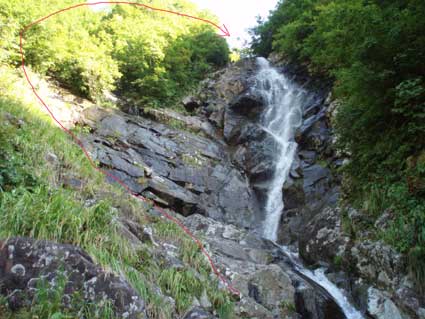 8:20 結構迫力があり、タラタラのセンかと思ったが10メートルの滝である。 右側にぬかるんだ階段状の登跡があり、ここを登った。 |