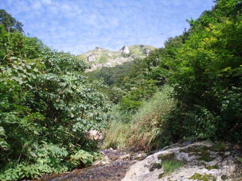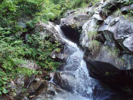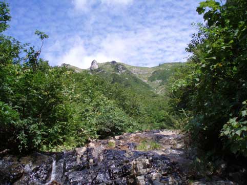 地図上では1180メートル地点にも二股がありそうだが、私は気が付かずに通りすぎてしまった。 9:35 二股に到着。 1180メートルの二股かと思ったがGPSで確認すると 緯度経度が1240メートルの二股 (北緯36度51分11秒、東経138度58分10秒)とぴったりで 位置が確認できた。 正面の方が水流はやや少なく大きな岩がある。右側の方が角度は大きく曲がるが水流は多い。真っ直ぐ行けばジジ岩の左のルート、右へ曲がればジジ岩の右のルートで頂上に直接出られるはずである。 右へ行くことに決めた。 おにぎりを食べ休憩。 |