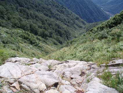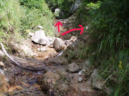 右股のルートはジジ岩の右のルートにつながっているのが分かる。 段々水が涸れてくる。 途中もう一回二股に分かれている所があるが、右側は頂上と違う方角なので、左へ進んだ。 天気が悪く見通しが悪い状況だと間違えるかもしれない。 |