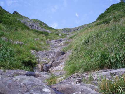 気持ちの良いスラブ状の斜面だ。 水はほどんどないが、水が流れそうな所をたどっていくと登っていける。 |