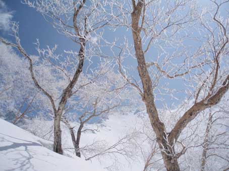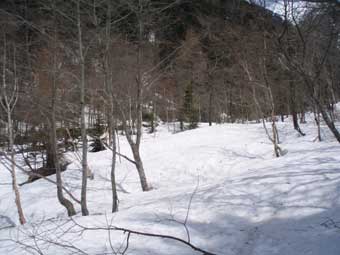 白出沢を渡ると樹林帯の中を歩くことになる。 ここまでは快調に来たが、この先疲れが出てきた。 涸沢岳西尾根の取り付きを過ぎた先は、年末には夏道とほぼ同様に沢から少し離れた経路を通ったが、 この時期は蒲田川右俣の河原が雪で埋まっており、滝谷出合まで河原を歩いていけるので、 適当に河原に向かって降りていってしまえば良い。 快晴になった。 わずかにトレースはあったが気温が上がっていたためズボズボもぐるのでわかんをつけた。 〈写真は右俣谷の河原〉 |