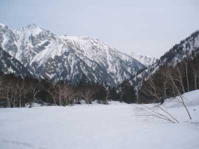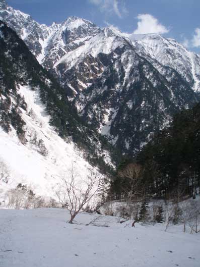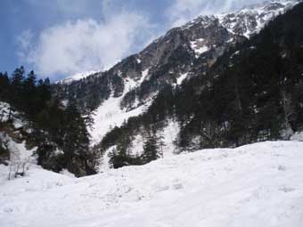 滝谷出合から2時間ほどで槍平に到着した。 快晴の槍平は別天地だ。 昨年末この場所で幕営していた人たちが雪崩に襲われ4人が亡くなった。 遭難場所が望めるところで黙祷した。 |