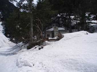 冬季小屋は別棟だ。 入り口の上に小さな窓があるだけで中はかなり暗かった。 平らな板の間で相当広いが、床は清潔で靴を履いたまま入っていく雰囲気ではなく、入り口で靴を脱いだ。 利用者は私一人で寂しかった。 利用料金1000円を入れる箱が柱にくくりつけてあった。 屋根の雪が溶けてたれている部分があったので、 そこで水筒やコッフェルに水をためた。燃料の節約になった。 |